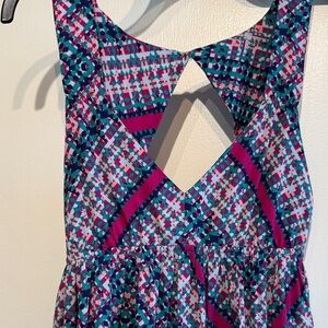 This stylish mini dress features a playful mix of colors, perfect and lightweight for summer or a beach vacation. Babydoll mini dress fit, somewhat high-low design. Open back.