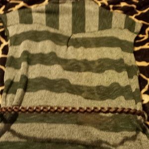 Light olive green and dark olive green thin cardigan sweater. Braided belt is included. Looks great with a cami and some jeans! Size XL.