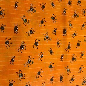 Fabric has a DANCING SPIDERS on a BRIGHT ORANGE STRIPED background.
