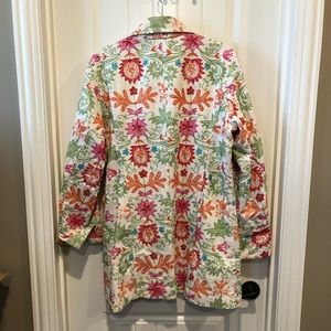 This spring coat has beautiful and fun embroidery in bright turquoise, green, red, pink and orange over a cream background. The sleeve cuffs can be worn down or turned up. Two side pockets can hold keys and phone. It’s a wonderful light layer to top off both work and casual outfits.