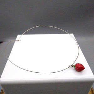 Fun Enamel Strawberry Pendant on Silver Tone Formed Collar Necklace, Vintage Delicate Wire with Sweet Little Summer Fruit Charm