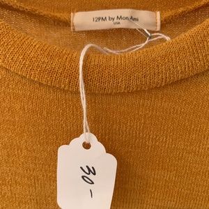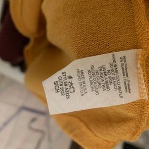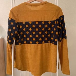 Lightweight Fall sweater in a trendy mustard yellow color with polk-a-dots on a dark featured gray background. Purchased in a boutique Florida store.