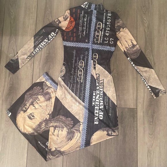 Blue face $100 bill long sleeve dress. Mesh. Very stretchy
