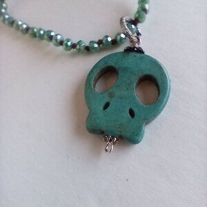 This is a hand wired faux skull pendant on a lightweight turquoise colored strand. A fun novelty necklace. One size fits all.