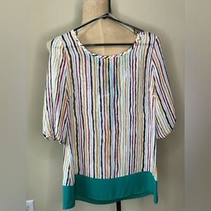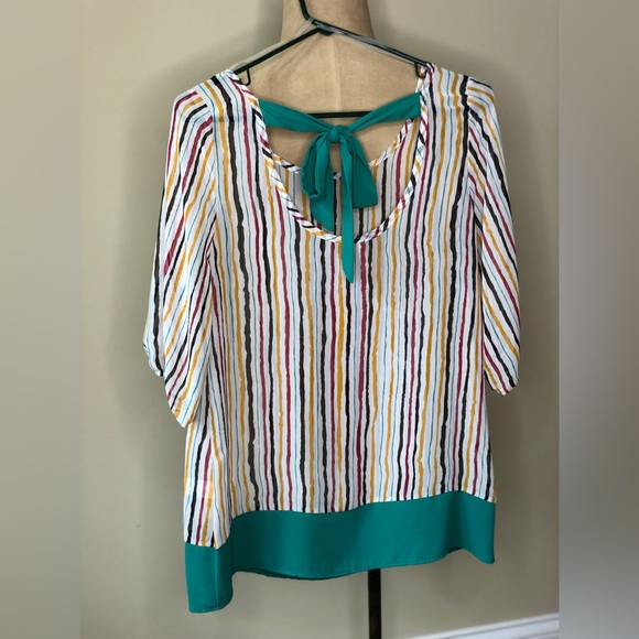 This blouse is so much fun, with teal trim and bow. This blouse is sheer and high quality material.