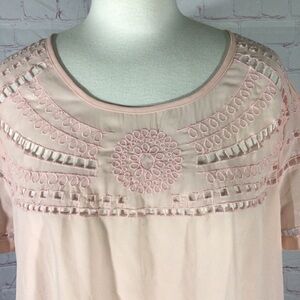 Fun & Flirt blush pink sheer embroidered cropped top. Size large. This beautiful top has has an embroidered design on both the front and back as well as various cutouts within the design. There is a zipper in the back. Made of 100% polyester. Machine washable. Great pre-owned condition. No rips, holes or stains. Smoke free home.