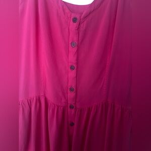 Chic coral romper with button-up front. Features delicate lace trim. Perfect for casual outings.