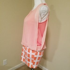 This dress is just fun with the orange and white checkered skirt and the open sides of the bodice. Back has a one button closure in silver. Top is lined and the skirt is very stretchy. Size a medium and measures 31" from top shoulder seam to bottom hemline. Dress is 100%polyester. Style number is EK3291. EUC