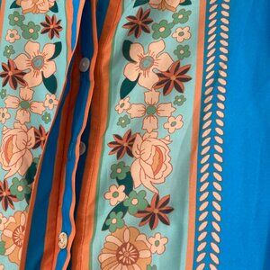 Fun floral dress Hidden front buttons Elbow length sleeves White lining Lenght: 52" Waist: 42" Additional details available
