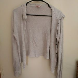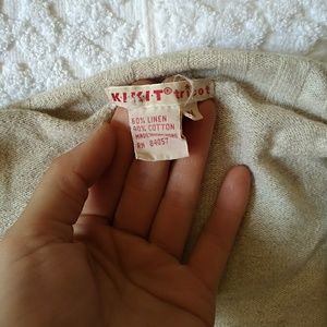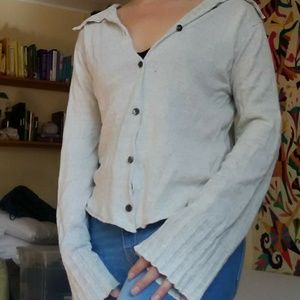 Love this tan cardigan! In great shape, no holes or stains, has all it's buttons. Light bell sleeve and small cape neck.