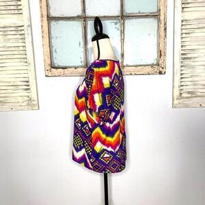 Fun and funky size small lightweight blouse by Forever 21. This top can easily be dressed up or down for any occasion. The bright colors and pattern really give it that 80’s and 90’s feel. Chevron and geometric pattern may by bright blues, yellow, pink, green, red, white, black, and orange. This shirt is in excellent used condition with no known flaws. Comes from a smoke free home.