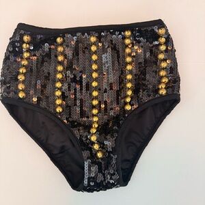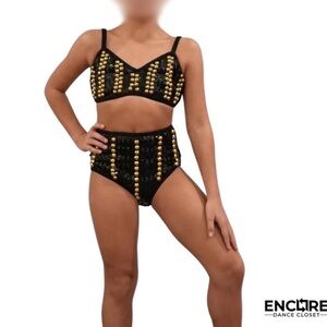 See photos for a measurement. It is stretchy with an adjustable and padded bra top