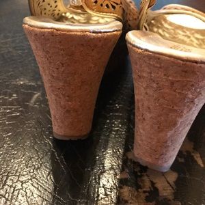 Super cute shoes with floral cutouts in the leather, shiny gold insoles, gold piping on the edges, and cork wedge heels!