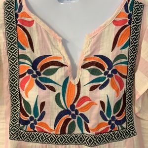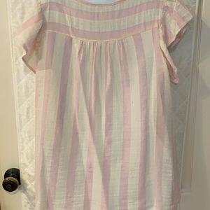 Cool and fun pink and white linen top with flutter sleeves and bright beautiful brocade print! So cute with jeans or shirts!