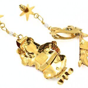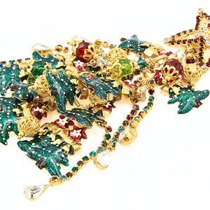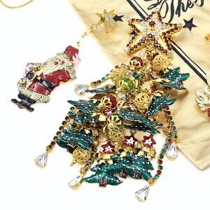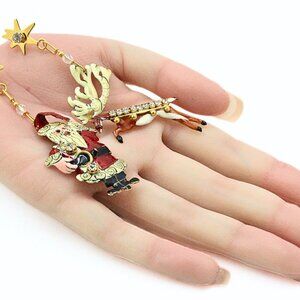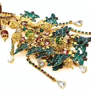 This festive designer jewelry set by Fun Lunch at the Ritz is a playful yet elegant tribute to holiday cheer. The set features a dazzling pair of mismatched dangle earrings—one designed as a charming reindeer with vibrant red enameling and a sparkling row of rhinestones, while the other showcases a figural Santa Claus, equally adorned with bright red enameling and rhinestones. Paired with these earrings is a breathtaking Christmas tree brooch, crafted from gold plate and decorated with green enameling, multi-colored rhinestone glass beads as ornaments, and a star at the top shimmering with red and crystal rhinestones. This set comes in its original dust pouch and is marked "LUNCH AT THE RITZ," ensuring its authenticity and collectible value. The brooch measures approximately 5 inches long by 2 inches wide, while the earrings, each around 3 inches long, vary in width, with the Santa Claus earring at 1 1/4 inches and the reindeer at 3/4 inches. The vibrant combination of colors, textures, and whimsical holiday themes make this set a perfect statement piece for the festive season. In excellent condition, this unique designer set captures the joyful spirit of Christmas in a fun and glamorous way.