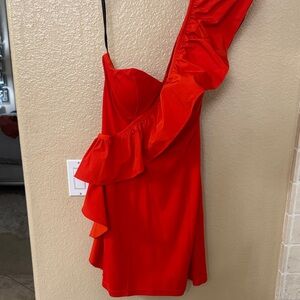 Turn heads with this stunning one-shoulder dress, perfect for any special occasion. The vibrant color and stylish design make it a must-have in your wardrobe. Has a small stain that can be removed by dry cleaners. Only worn once