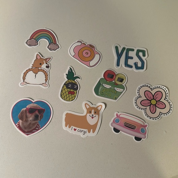 10 Fun Stickers (as shown in photos) such as Rainbow, Corgi Dog, FLower, Car, Camera, Pineapple, YES