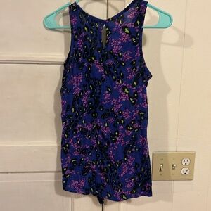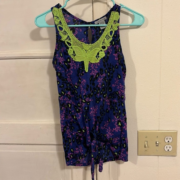 Fun printed tank top with lace embellishing. Tie front on bottom, smoke free home!
