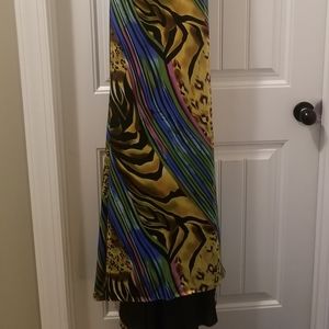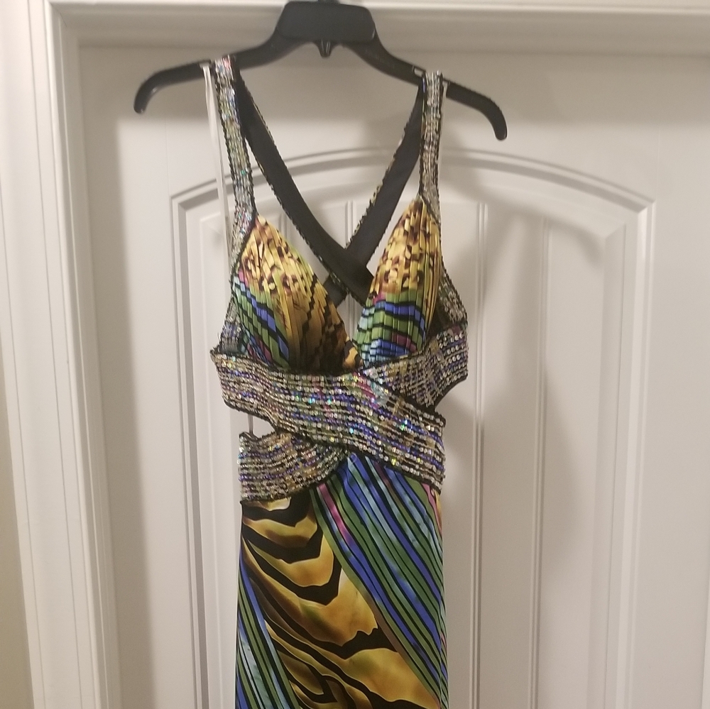 Crisscross back with beaded straps. Beads flow down the back. Colorful dress with a little animal print. Fun!