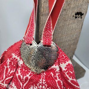 Fun Red Fabric Boho Purse w/ Metal Heart Decoration
