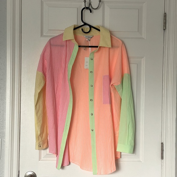 This oversized button down is so FUN!!! I wish I wore more colors but I am pretty much an all black kinda gal. Purchased this from a local boutique in northern Michigan thinking that I would wear this as a bathing suit cover up. Too cute to not be used!