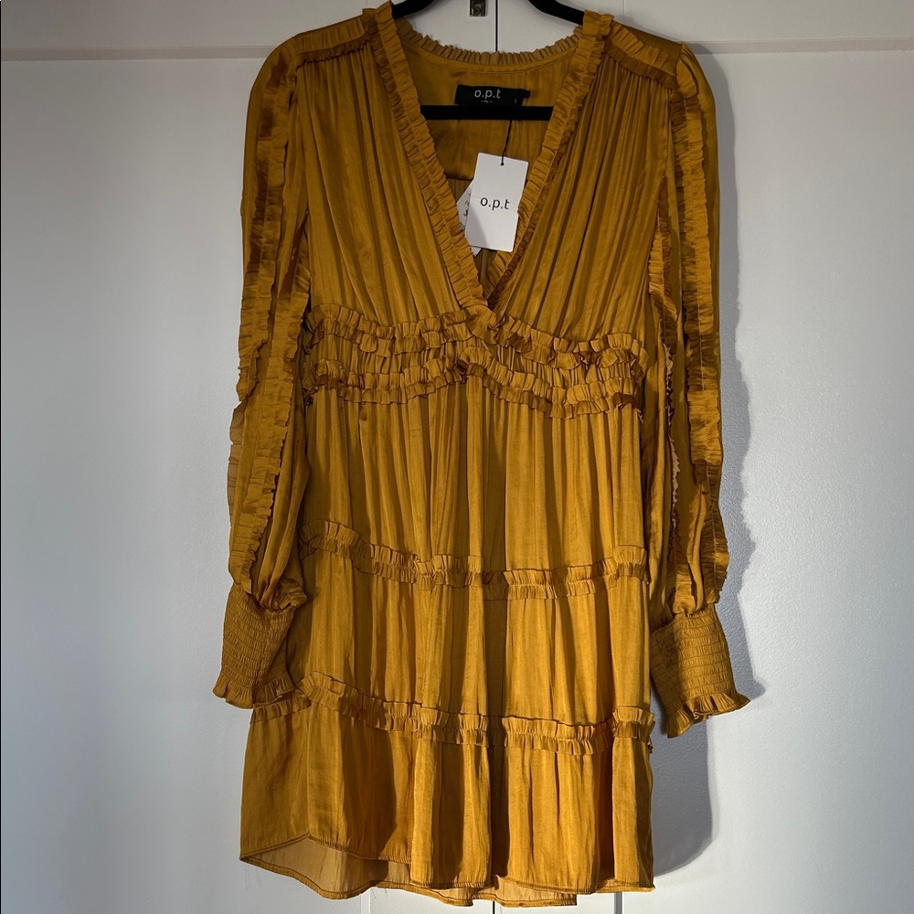 Stylish golden yellow dress with ruffle details. Ideal for any event. NWT. Never worn. Motivated seller open to offers.