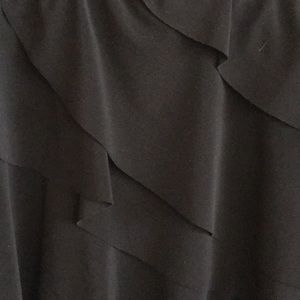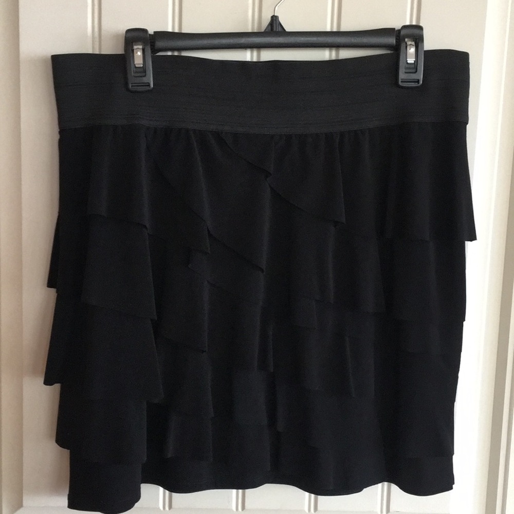 A nearly new black ruffled skirt. This has only been worn once. It is fun with lots of layers of ruffles. Has an elastic waistband. Length is about 16”.