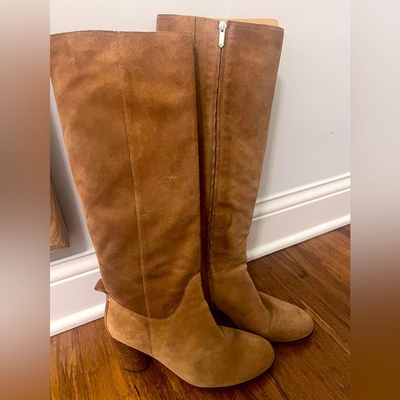 Heeled cognac suede boot. Heels in excellent condition. Mild staining on shaft (shown in photo)