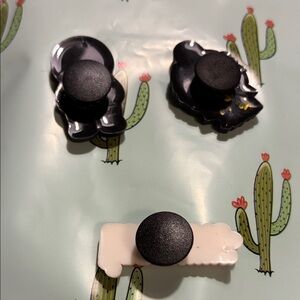 Set of playful shoe charms featuring a red character, Pickle Rick, and Dunkin' Donuts logo. Great for customizing your shoes.