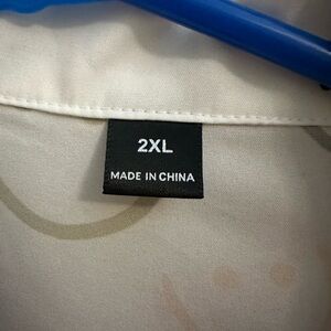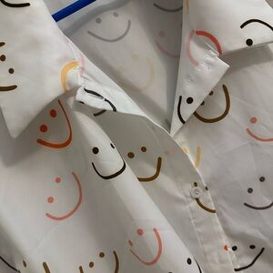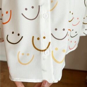 Chic white blouse with colorful smiley face print. Features a button-up front and a classic collar.