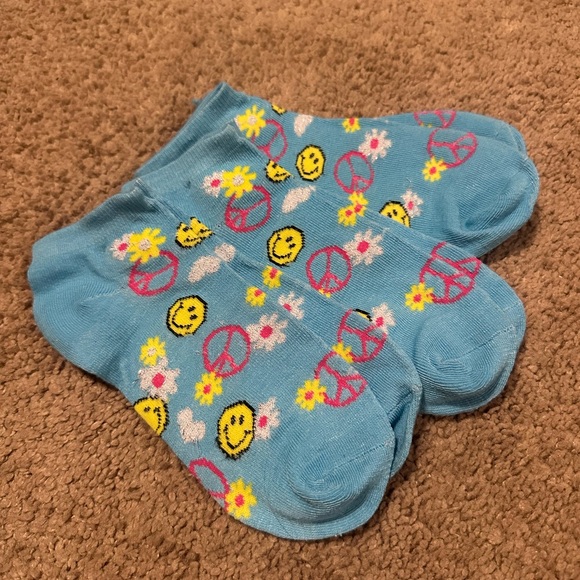 3 pairs of blue socks with smiley faces, peace signs, and daisies.