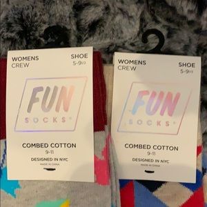 Women’s Fun Socks. One gray with colorful leaves and the other has colorful geometric squares. Fits shoe sizes 5-9.5. Brand new with tags. Smoke free home.