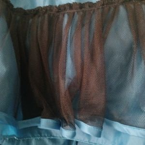 This dress is too cute for words. Dark turquoise in color witk black embroidered flowers fading out at the bottom. Sateen shine it buttons and ties in the back. Add lining with tuelle ruffle for fullness at the bottom. Finishing touch is a black faux belt with a Sparkley flower that only visible in the front. Like new.