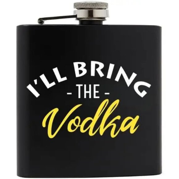 Stainless steel 6 oz. hip flask with a slim profile and printed text design