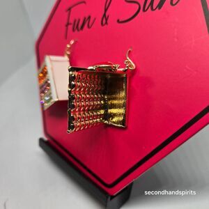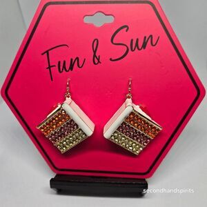 These are colorful, fun earrings designed to resemble slices of layered cake. The earrings feature rhinestone-encrusted layers in orange, pink, and champagne tones, giving them a sparkling effect. The "cake" is bordered with white enamel, and there’s a small detail at the top resembling a cherry . The design hangs from gold-tone hooks, adding a playful and whimsical touch.