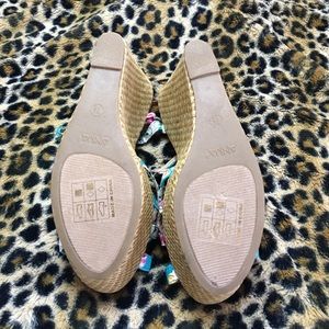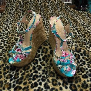 Floral T-strap wedges that are teal with some pink, yellow, grey flowers! Never worn! 5" wedges with 2" platform! True to 7 1/2 size.