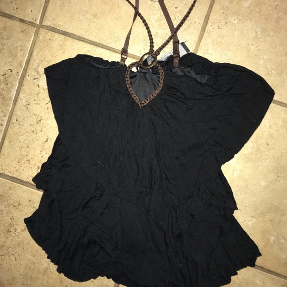 Black flowy tank top with braided rope like strap coming from the middle of the top of the tank top