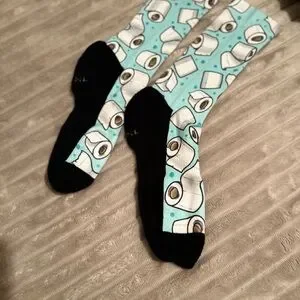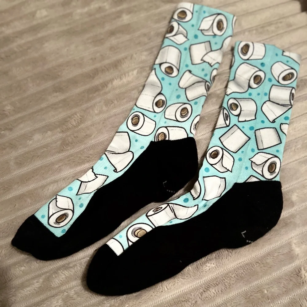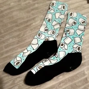 Quirky compression socks with a toilet paper design. Features a playful blue and black color scheme. Only worn a few times Pet/Smoke free home
