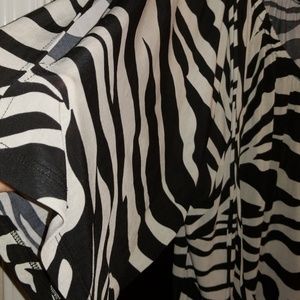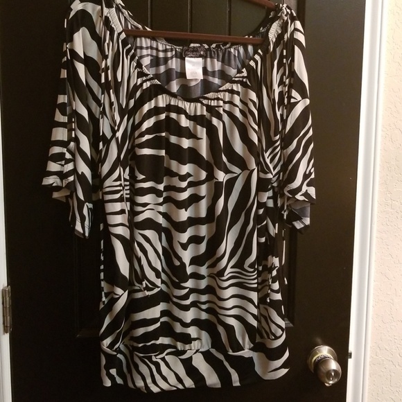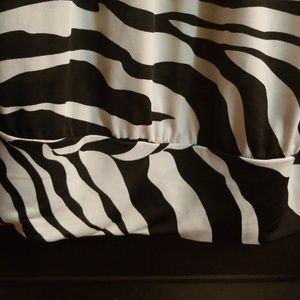 Black with creme zebra-like print top featuring cold shoulder sleeves and a banded bottom making this very figure flattering.