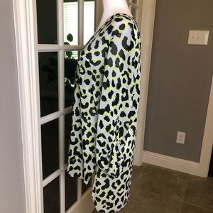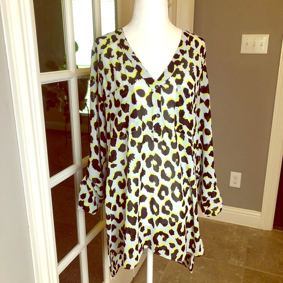 This lightweight nearly sheer animal print top is a show stopper! Such a fun top! Hints of yellow accents makes it very unique. Pockets and buttons in the front (v-neck). Back is longer than the front. Sleeves can be buttoned/rolled up with side button straps.