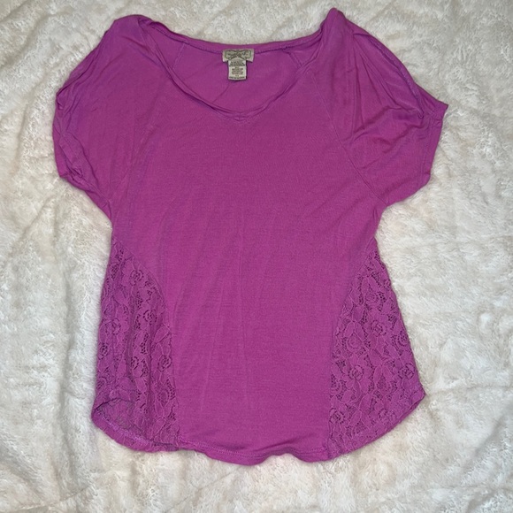 Pink/Purple top with some lace detail and cut out sleeves. Gently worn.