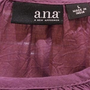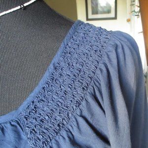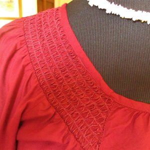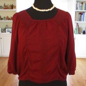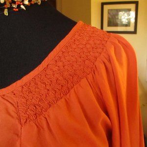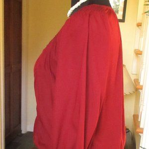 These tops are fun to wear and very comfortable. Pretty decorative stitching at the neck and shoulders, 3/4 length sleeves with elastic at the elbow, and loose elastic at the hem of the top. Four colors: dark blue, wine, orange, and light purple. The orange one comes with a matching choker necklace. Size L. $4 each.