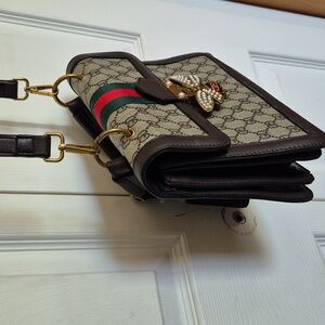 Discover elegance with this fun satchel, featuring a classic beige and brown pattern. The striking red and green stripe adds a touch of luxury, perfect for any fashion-forward wardrobe.
