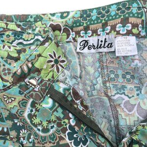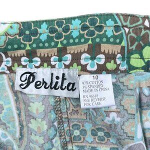 Step into comfort and style with these Fun Pants by Perlita, size 10. Crafted from a soft blend of 97% cotton and 3% spandex, these pants offer a perfect balance of breathability and stretch for all-day wear. Featuring a vibrant, playful pattern in soothing shades of green, blue, and brown, they add a whimsical touch to any casual outfit. The drawstring waist ensures a customizable fit, while the lightweight fabric makes them ideal for relaxed weekends or lounging at home. These pants are pre-loved but remain in great condition, ready to bring fun and flair to your wardrobe. Embrace effortless style with these unique Perlita pants that combine comfort, color, and personality in one perfect package.