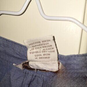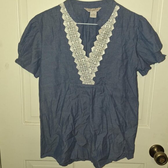 The combination of the casual blue fabric with the elegant lace and playful puff sleeves creates a versatile piece that embodies the brand's name, suitable for various casual or slightly dressed-up occasions.
