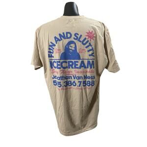Add a playful touch to your wardrobe with this Jonathan Van Ness “Fun and Slutty Ice Cream” tee! Featuring a quirky graphic of a melting ice cream cone, this soft beige shirt is perfect for fans of JVN’s unique brand of humor. Made from 100% cotton, this tee offers a relaxed fit and plenty of comfort for casual wear.