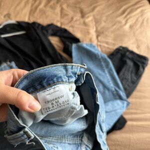 Love these jeans, espcially with the back clasp. I believe I thrifted these so they have lived a long life, but are wonderfully broken in because of it. Frayed at the bottom, no holes. Straight jean fit. Size 8 (I believe)