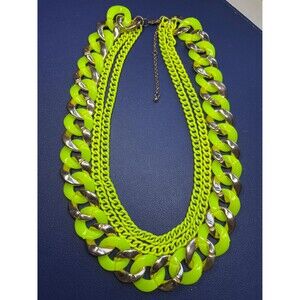 2) Two neon green metal chains and a neon green acrylic/gold tone link strand make up this multi strand necklace. Lobster claw clasp closure, measures approximately 17” with a 3.5” extender