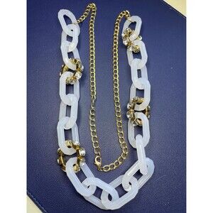 3) Gold tone double link chain holds white faceted translucent acrylic links and rhinestone covered links. Lobster claw clasp closure, measures approximately 36”L