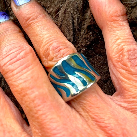 Silver untarnish metal ring with teal inlays